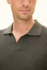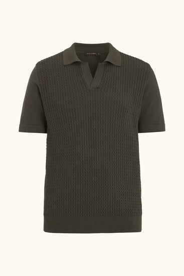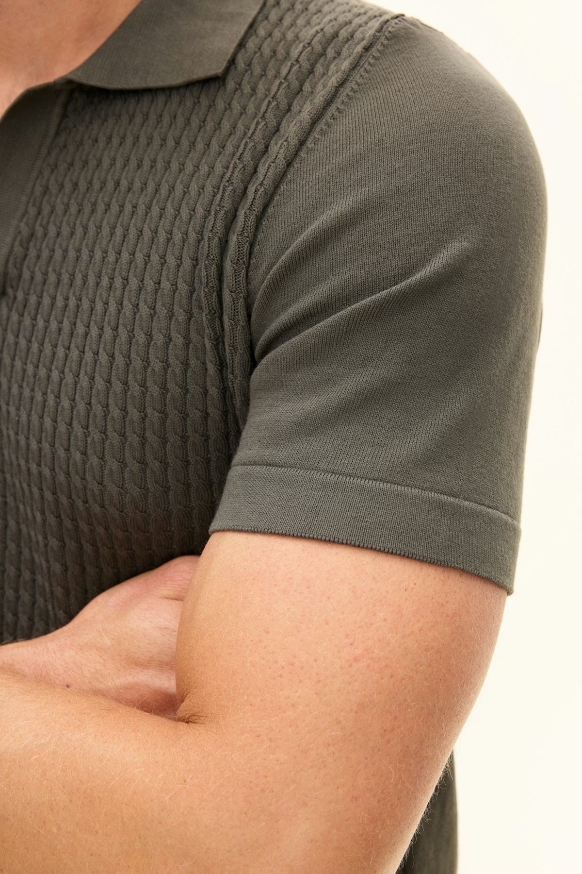 Kortärmad stickad kragtröja i plaggfärgad bomull. Stickad i 12gg med fin kabelstruktur på framstycket. Utan knappar fram som ger ett mer ledigt uttryck. Fint plagg att använda till uddabyxor men kan lika gärna bäras under en ledig kostym eller kavaj.