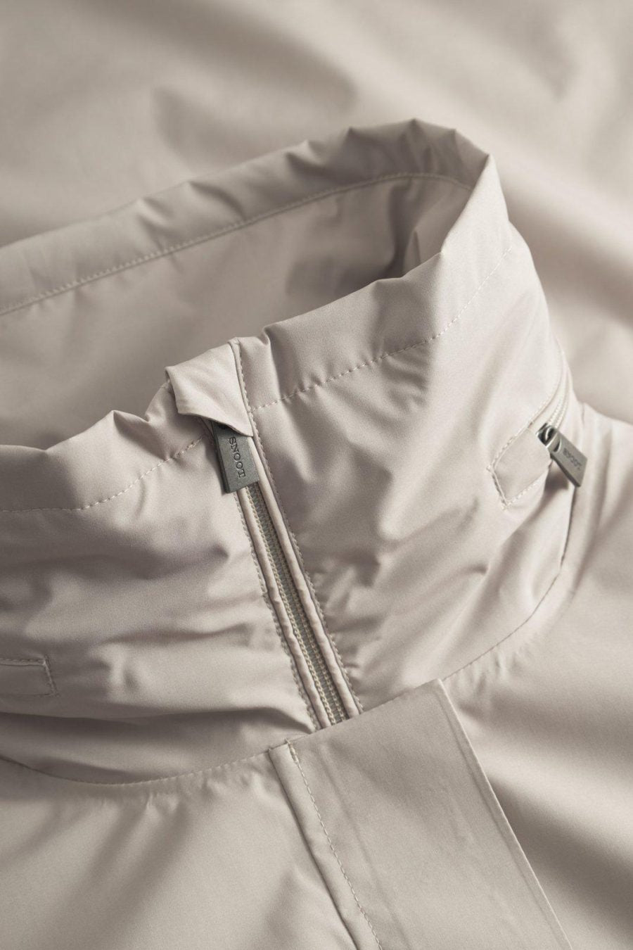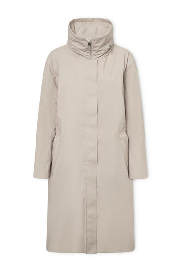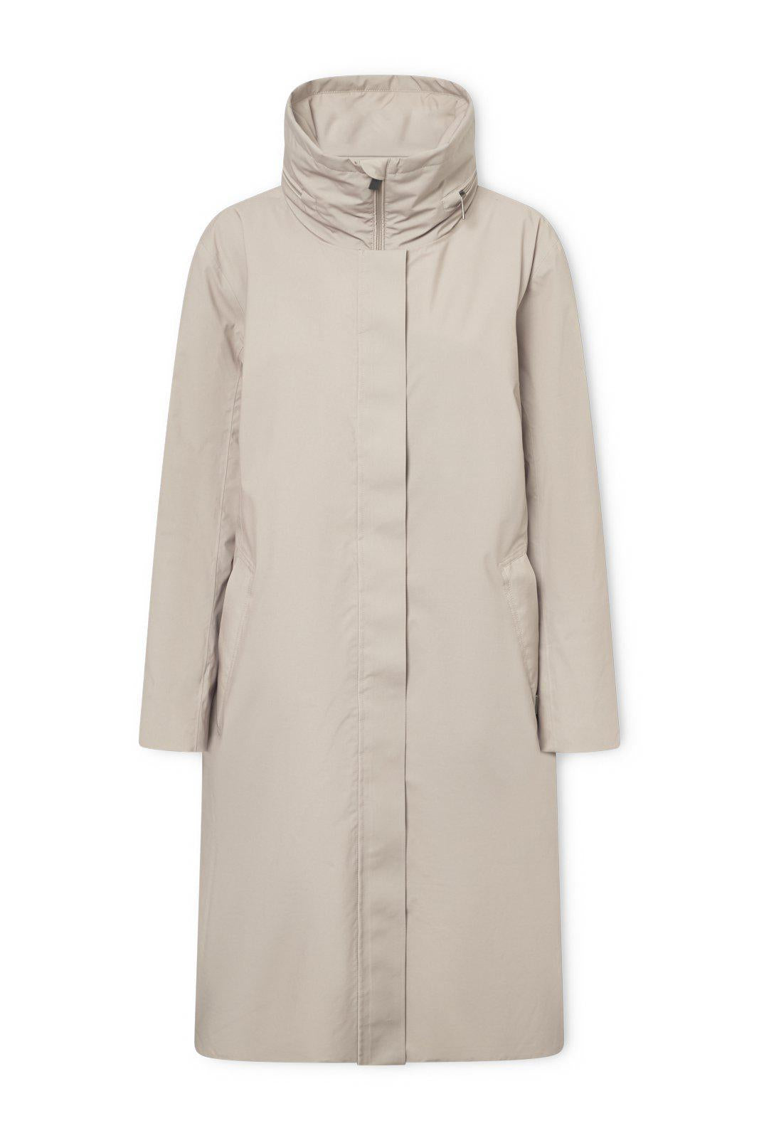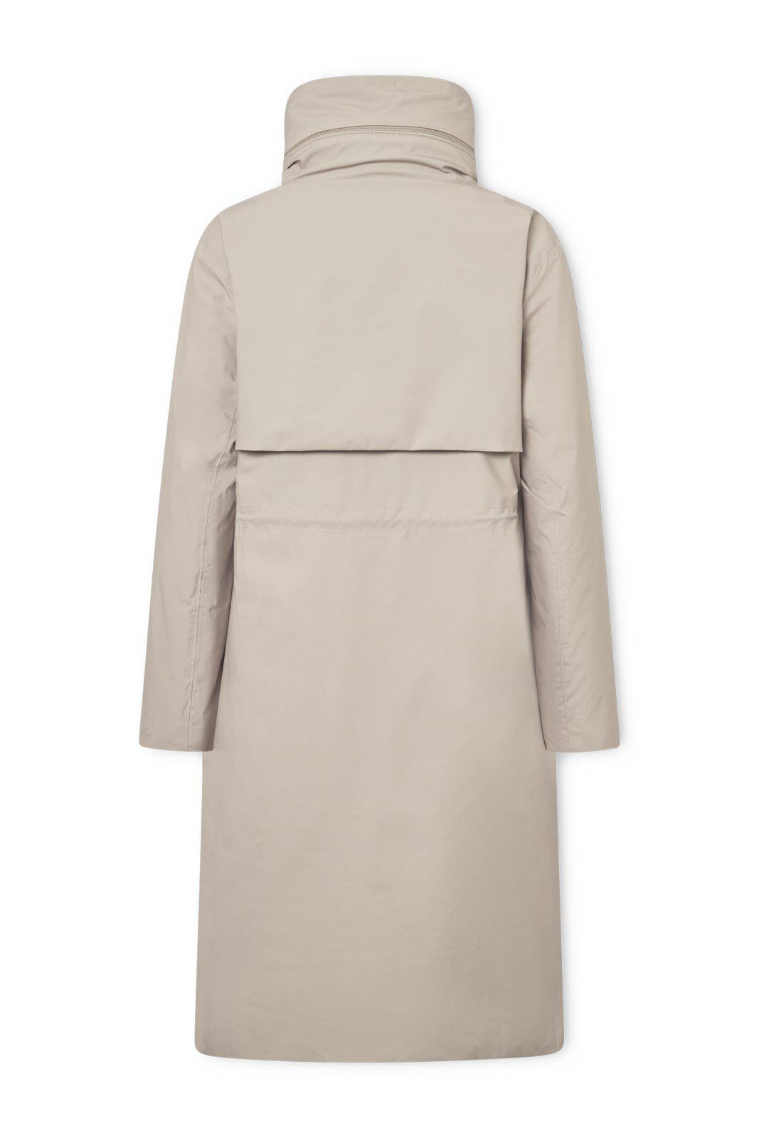 Den rena, minimalistiska designen har en dold tvåvägsdragkedja bakom en stilren frontslå. För extra funktionalitet finns en justerbar, packbar huva dold i kragen och midjan kan anpassas för en mer personlig siluett.