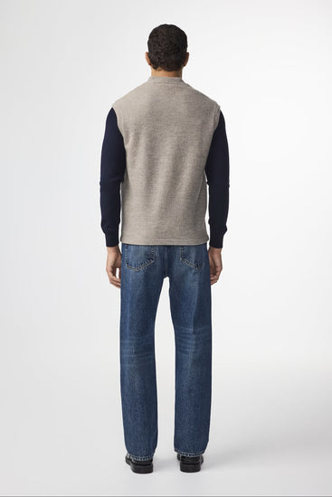En väst med dragkedja tillverkad i mjukt kokt merinoull. Med minimalistisk bomberkrage och kvadratiska dubbla fickor.
