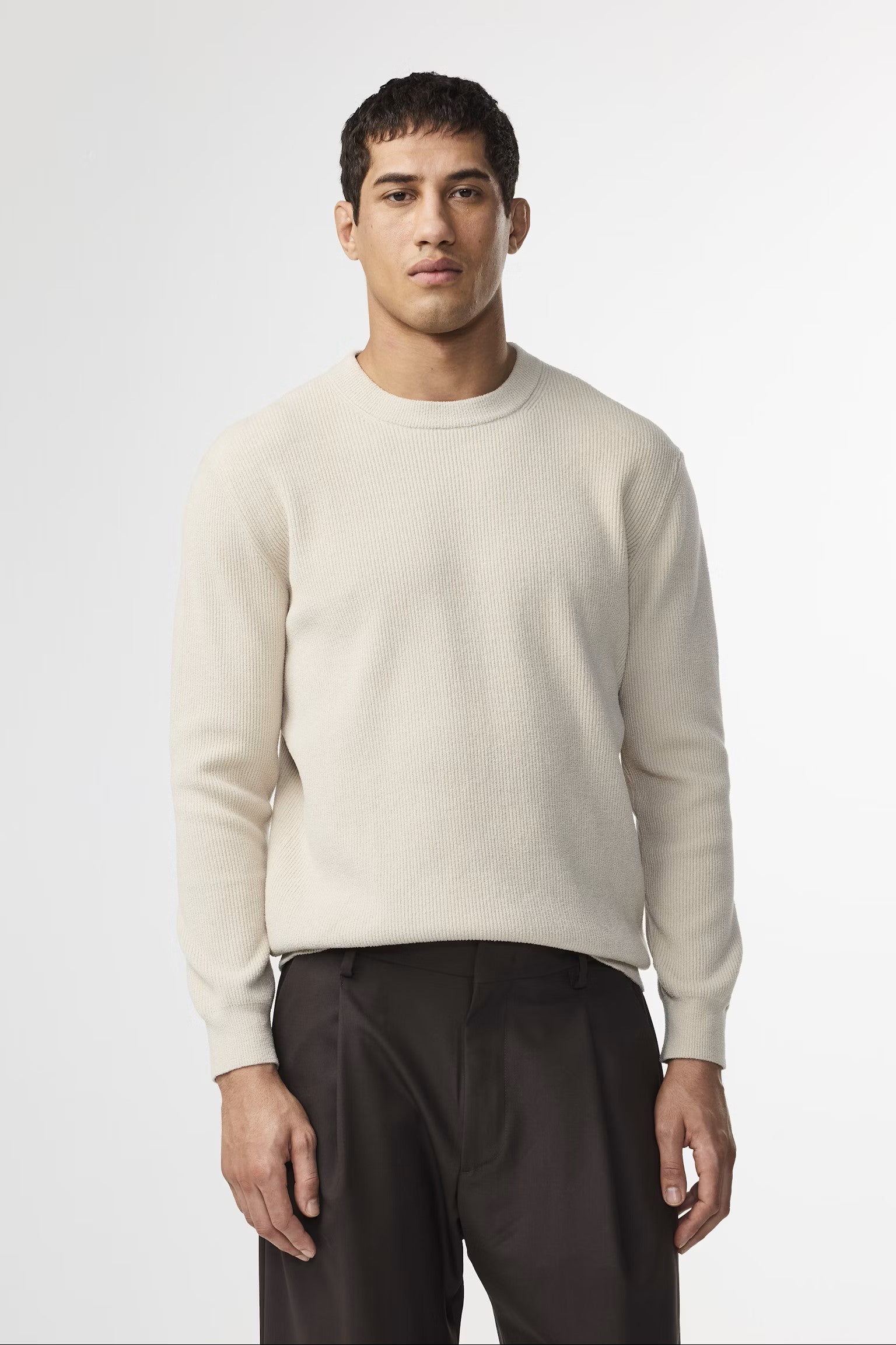 En mjuk rundhalsad tröja tillverkad i en mycket mjuk polyesterblandning. Designad med en snygg ribbning och modedetaljer längs armen och halsringningen.