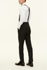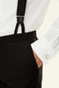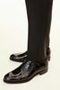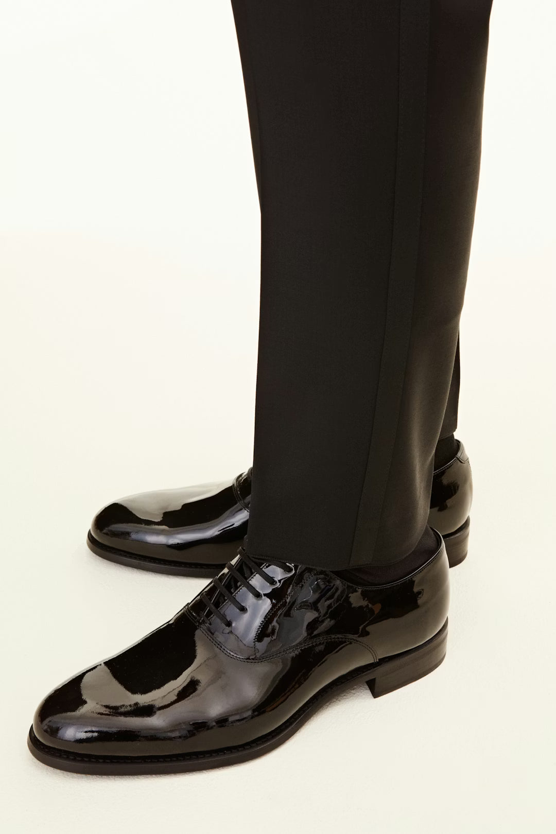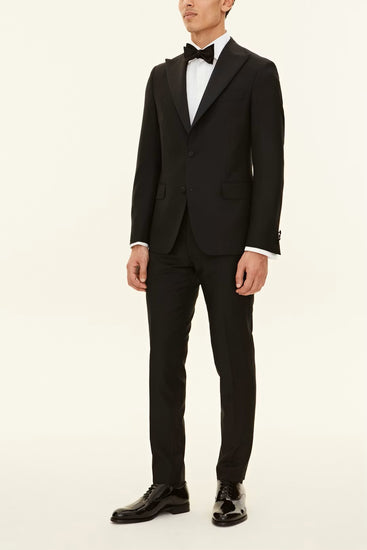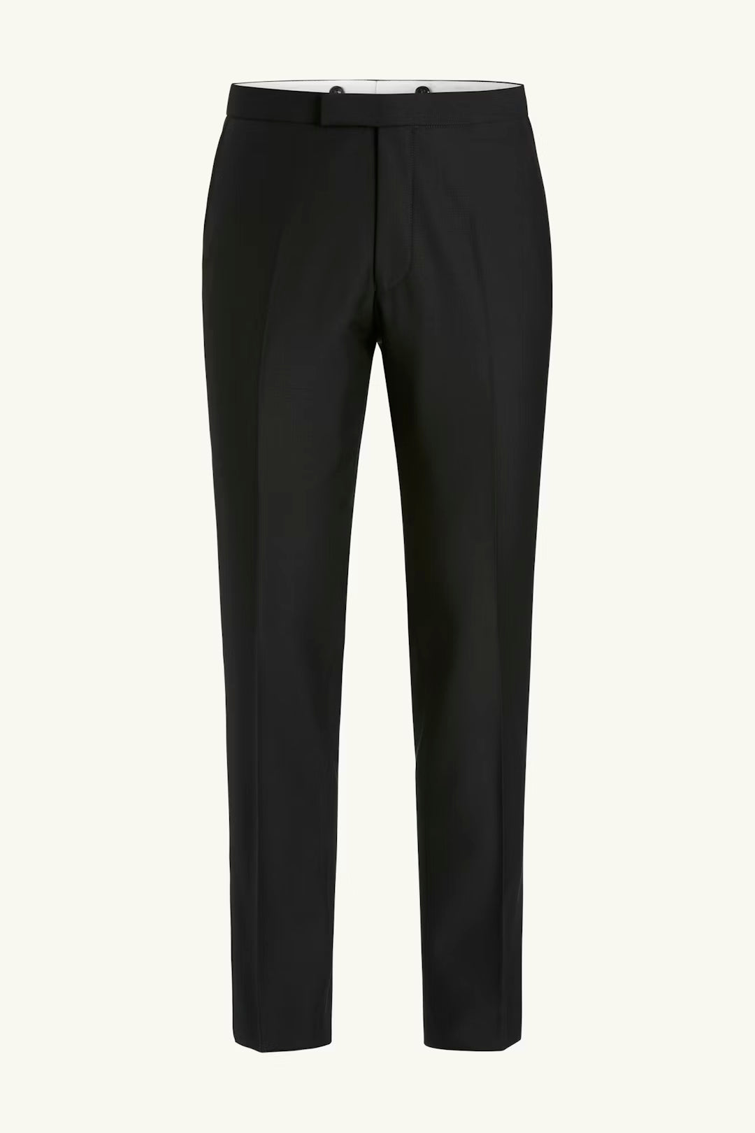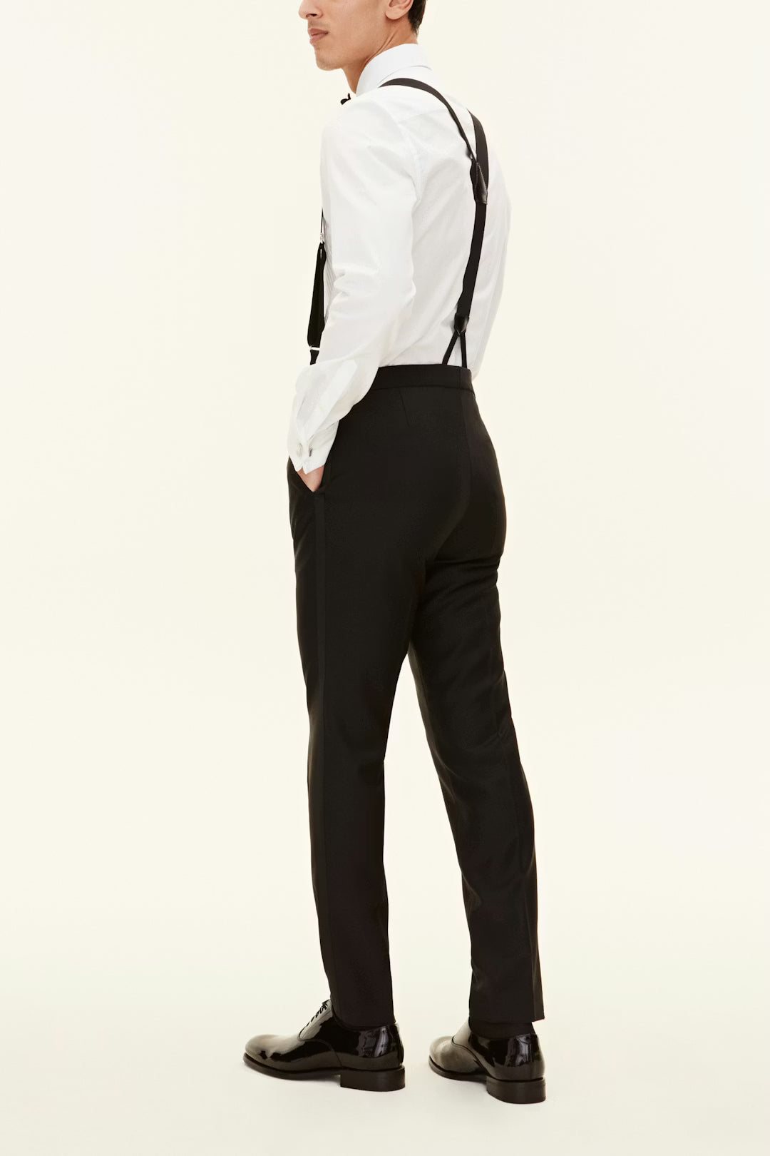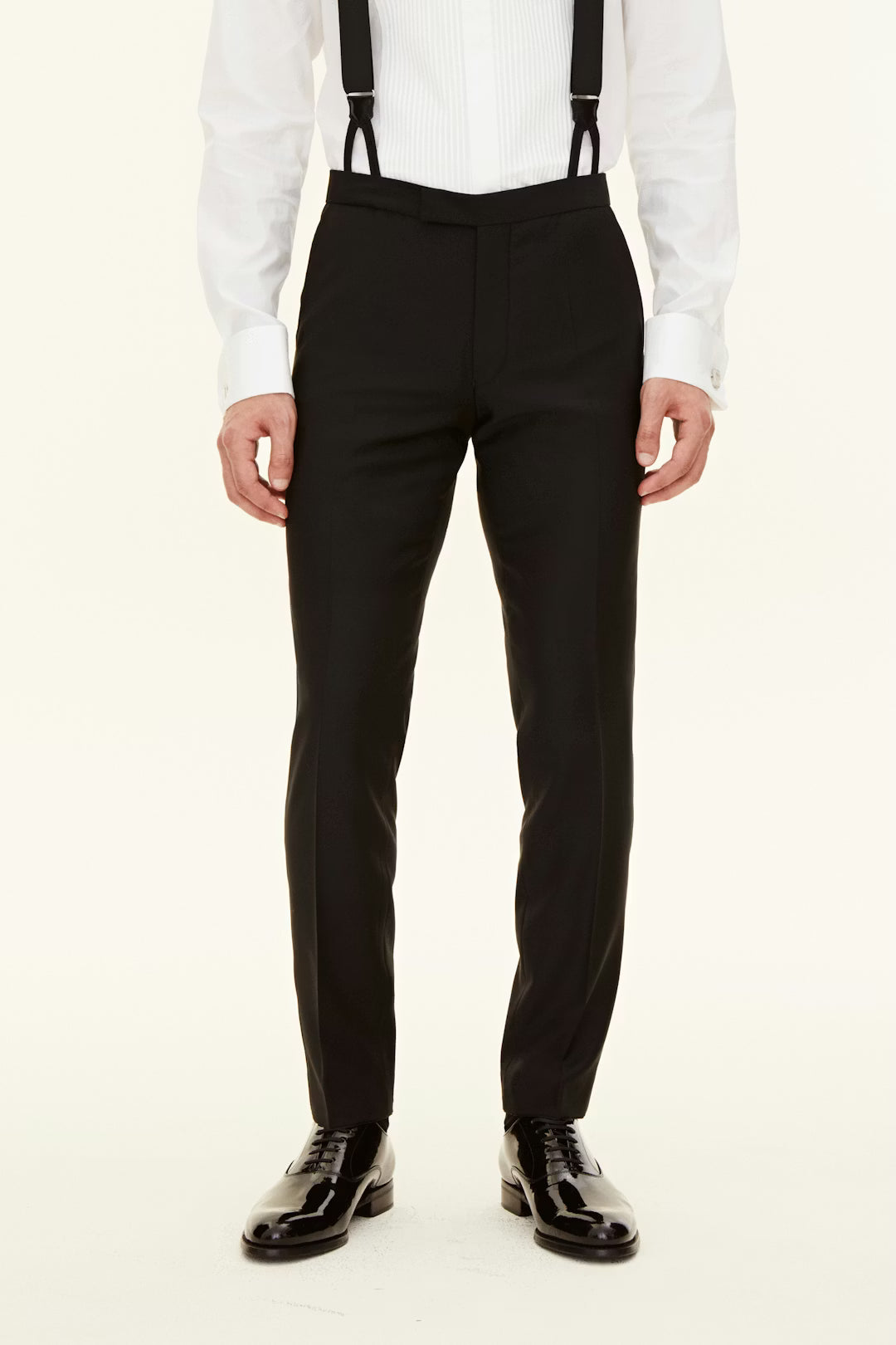 Klassiska smokingbyxor med sidenrevärer. Den här modellen är tillverkad i 100 % ull och har en smal passform. Försedda med knappar på insidan av midjan för att fästa hängslen. Modellen bär storlek 48 och är 185 cm lång.