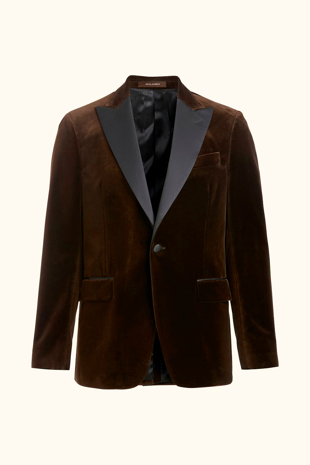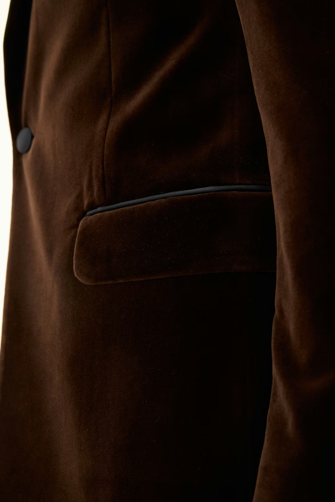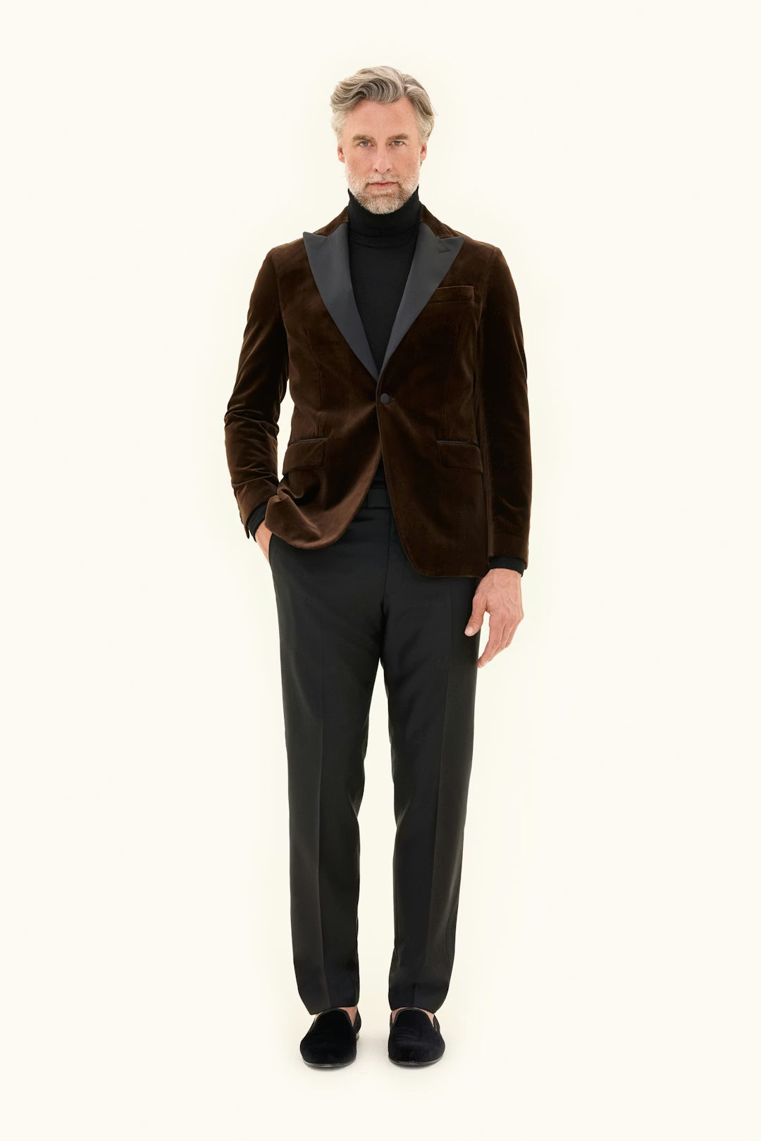 Smokingkavaj i sammet med spetsiga sidenslag. Tillverkad i bomull från vävare Pontoglio. Normal passform som ger en modern silhuett utan att kännas tajt. Helfodrad insida i viskos för ökad komfort och känsla. Modellen bär storlek 50 och är 188 cm lång