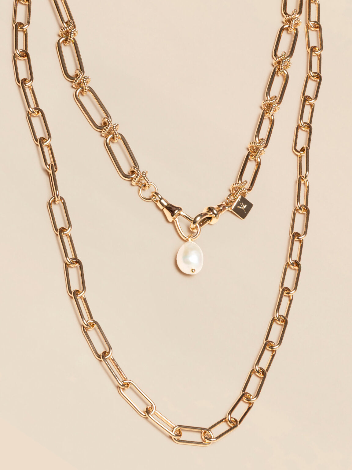Vårt signaturhalsband – den avslappnat stiliga och mångsidiga Yves. Sammanfogat med små knutar av 18k guldpläterad mässing, där varje länk bildar lager på lager till ett halsband som är både kaxigt och feminint – och som garanterat kommer att få alla att prata.
