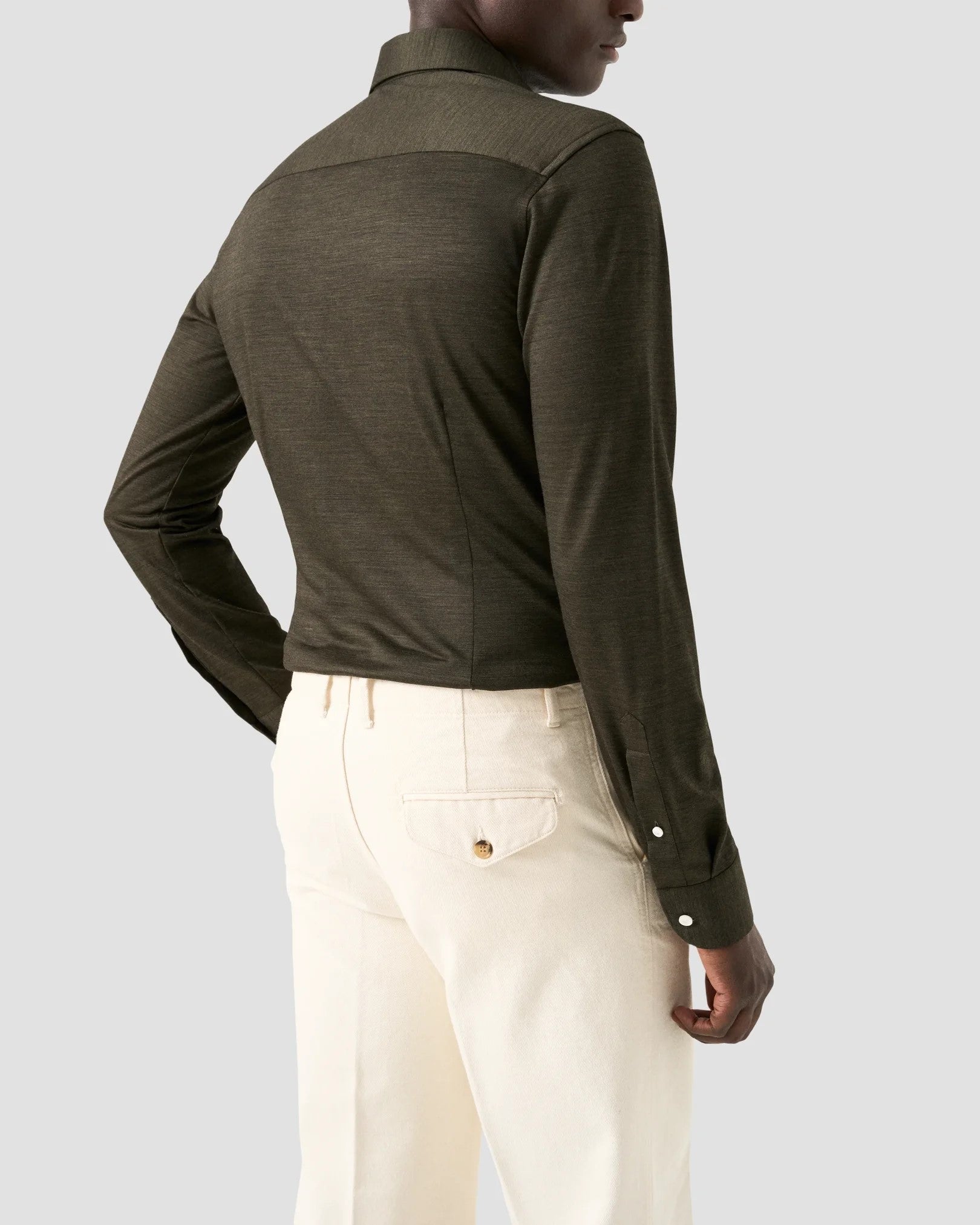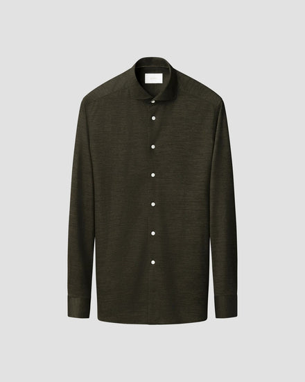 En skjorta med perfekt fall, sydd i en extra mjuk merino-jersey från italienska Reda som har naturlig stretch och exceptionell andningsförmåga. Skapad för att kombinera komforten hos ett stickat plagg med strukturen hos en välskräddad skjorta. Kan tvättas i maskin och pärlemorknapparna sätter en elegant prägel på din vardagsstil.