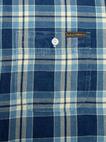 Denna långärmade skjorta är tillverkad i ett lätt, mjukt och följsamt rutigt tyg i olika nyanser av blått, där den mörkaste nyansen är indigo – den levande färgen. Det innebär att färgen kommer att blekna och förändras med användning och tvätt. När du köper denna skjorta kan du vara säker på att vi har betalat vår del av levnadslöner.