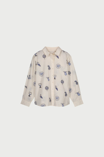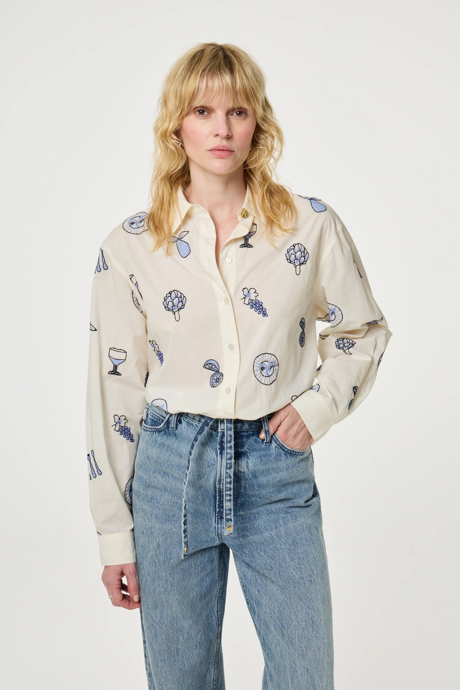 Denna vita blus är prydd med blå broderier över hela plagget, föreställande glas och tallrikar – inspirerade av ett vackert dukat sommarbord. Tillverkad av 100 % ekologisk bomull är den ett riktigt statement-plagg. Matcha den med dina favoritjeans för en lekfull och feminin look.
