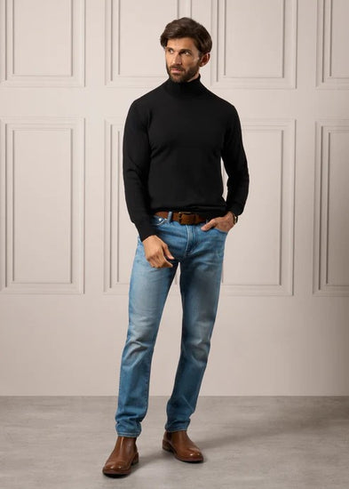 Förhöj din vintergarderob med en klassisk rullkrage. Den är alltid trendig och en sofistikerad basplagg för varje gentleman. Tillverkad i fin italiensk merinoull, denna lättskötta underbara fiber är otroligt mjuk, naturlig och andas. Hur kommer du att bära din?