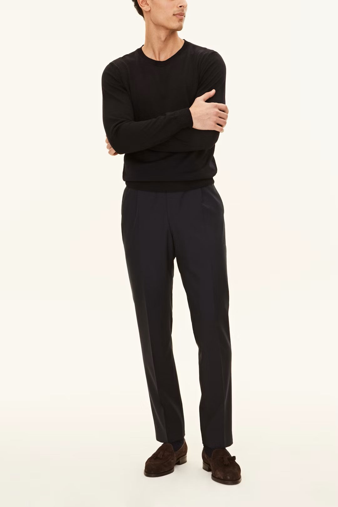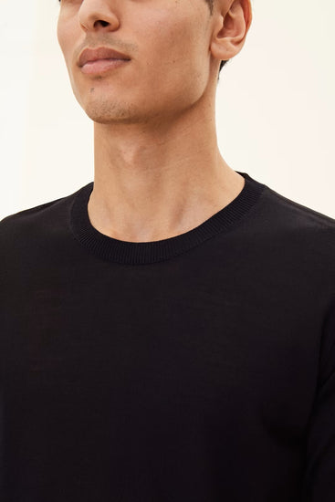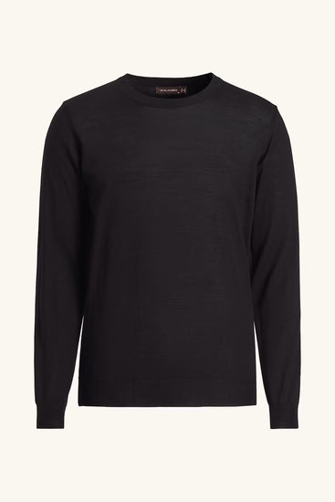Rundhalsad tröja i extra fin merinoull från Tollegno, Italien. Ullfibrerna är långa vilket ger plagget en lyxig och ngt glansig yta. Enkel halsrib i dubbla garner som ger fin stadga. Tunt stickad, 14gg som passar bra att ha under kavaj.