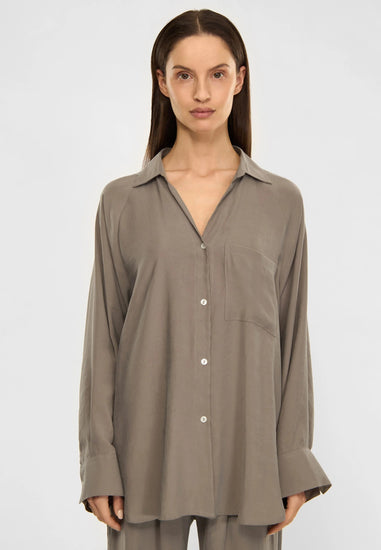 Milena är en skjorta med avslappnad passform, tillverkad i Modal Blend. Materialet är mjukt, lätt och draperande, vilket ger plagget en känsla av ”lättare än luft”. Detaljer inkluderar en öppen V-ringning, raglanärmar och en rundad fåll med höga slitsar i sidorna. Bär Milena tillsammans med Lana för en komplett sommar-outfit.