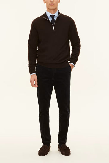 Långärmad tröja i half zip-modell tillverkad i supermjuk ull och kashmir. Perfekt att bära som ett extra värmande lager under kavajen eller som den är till ett par uddabyxor.