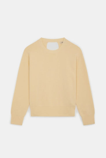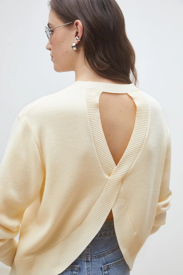 En enfärgad tröja i krämig ljusgul med en elegant korsad detalj i ryggen som skapar ett stilfullt och feminint uttryck. Korset är perfekt placerat för att dölja bh-band i rygen. Modellen har rund halsringning och långa ärmar för en klassisk silhuett. Den öppna, korsade ryggen ger plagget en modern twist och gör det lika fint till vardag som till mer uppklädda tillfällen. Tröjan är tillverkad i FSC-certifierad viskos, ett mer ansvarsfullt materialval. Otroligt mjuk!