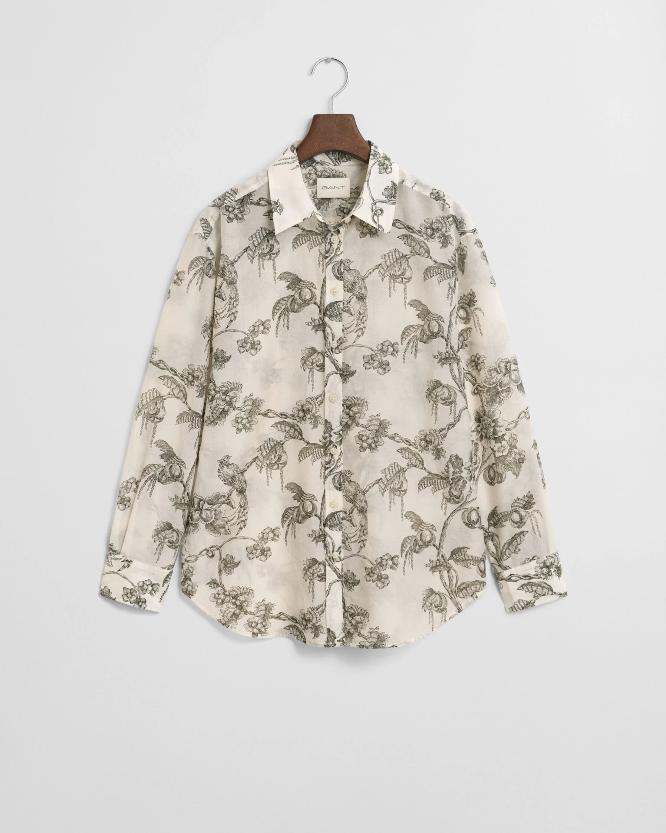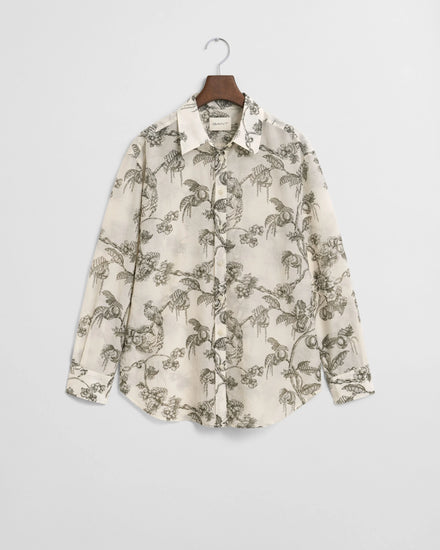 Den här skjortan är tillverkad i en premium bomulls- och silkesblandning och har ett unikt, höstligt trädmönster skapat av våra designer. Den har en point-krage, rundad fåll, återvunna polyesterknappar och boxpleat med vår klassiska locker loop i ryggen. Plagget har en relaxed fit. För en mer figurnära passform rekommenderar vi att du väljer en mindre storlek.