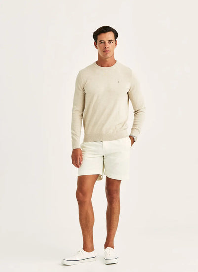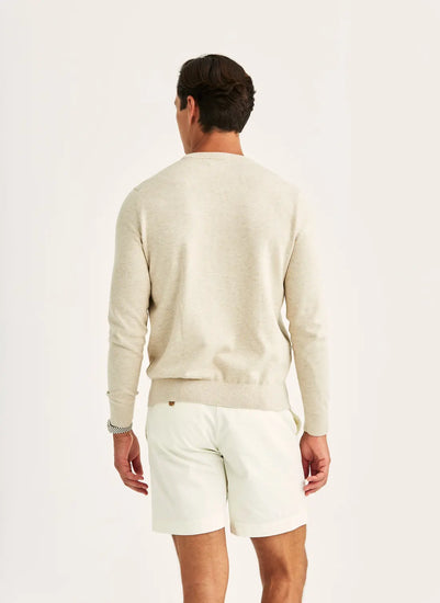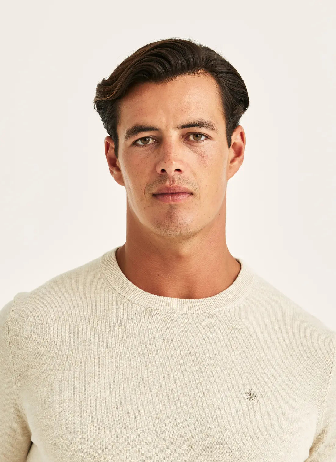 Riley Oneck är stickad i förstklassig bomull med en len men stadig känsla, tillräckligt lätt för att hängas över axlarna, men med struktur som håller formen. Den broderade liljan på bröstet ger en karakteristisk Morris-detalj. Avslappnad, elegant och oändligt mångsidig.
