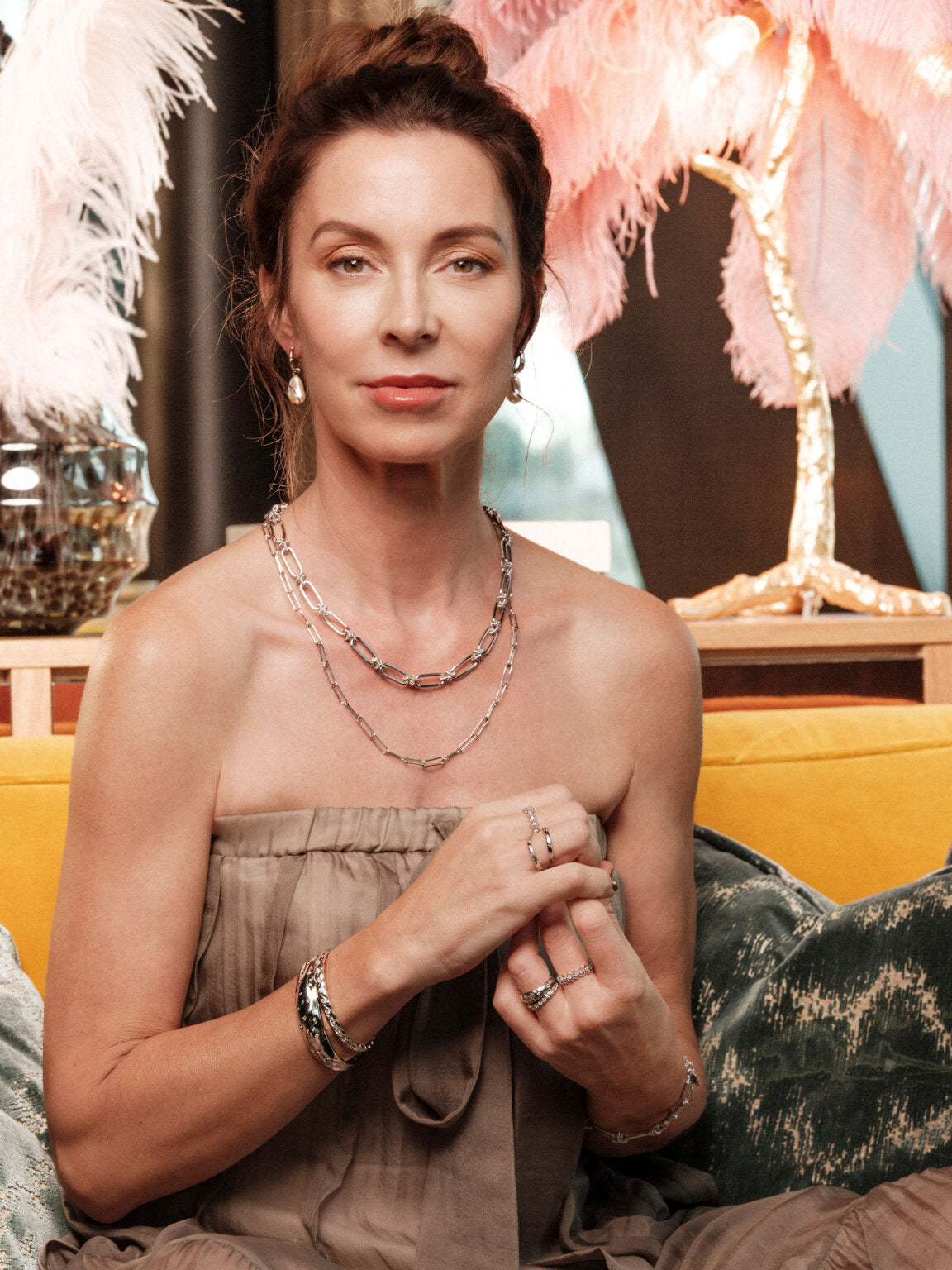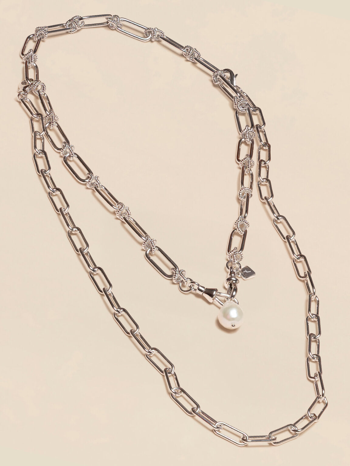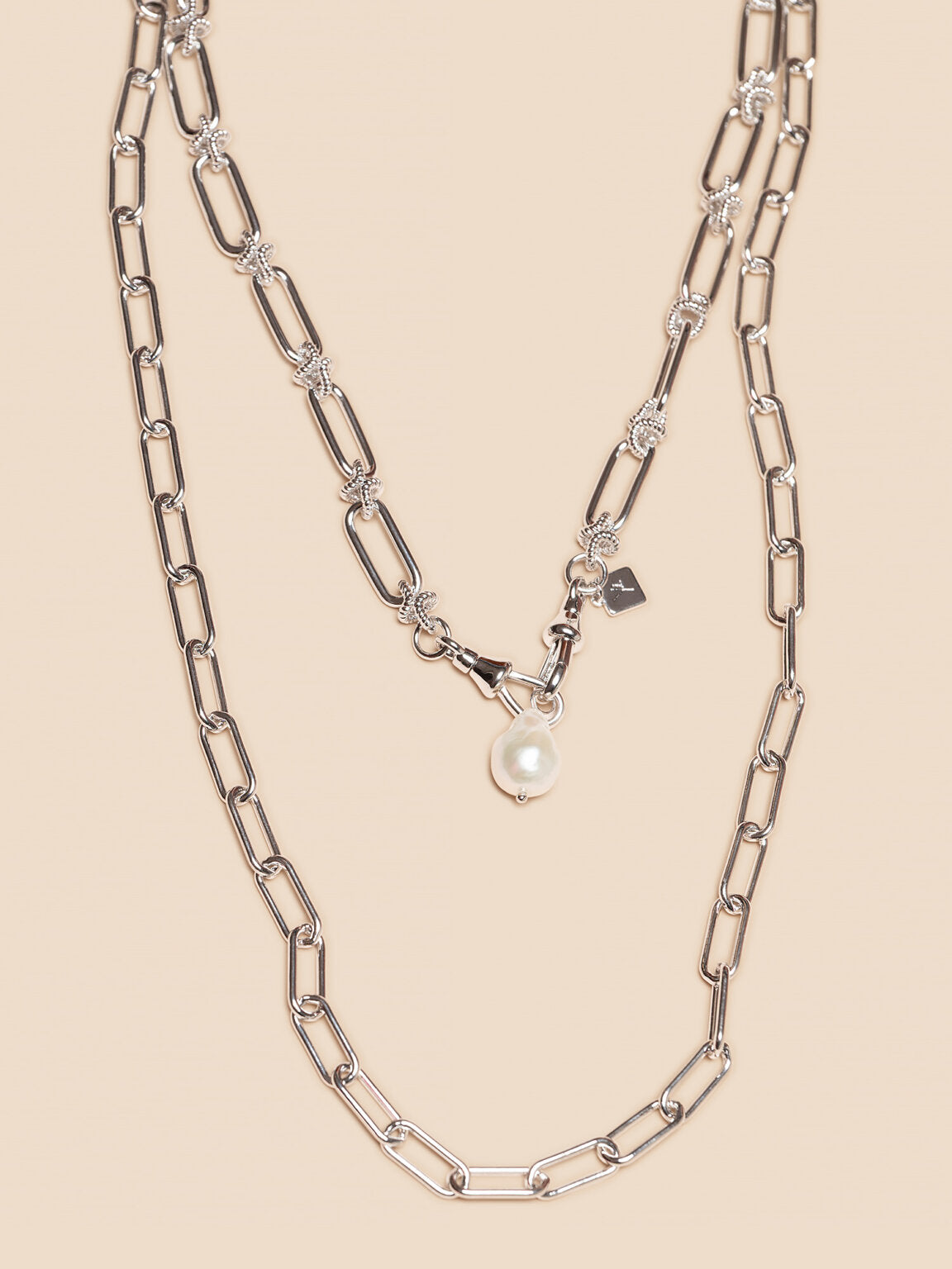 Vårt signaturhalsband – den avslappnat stiliga och mångsidiga Yves. Sammanfogat med små knutar av silverpläterad mässing, där varje länk bildar lager på lager till ett halsband som är både kaxigt och feminint – och som garanterat kommer att få alla att prata.