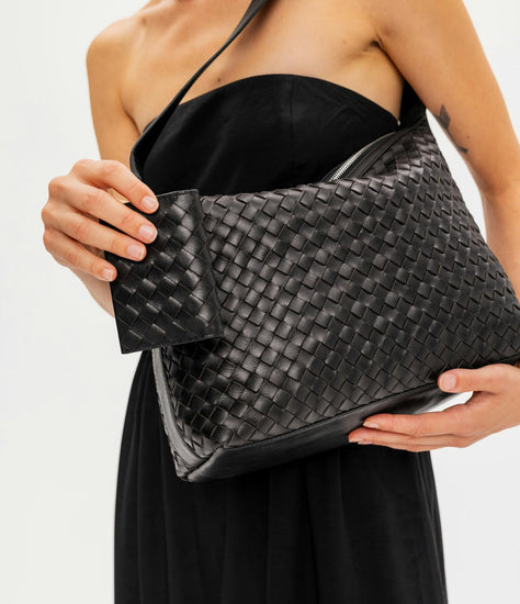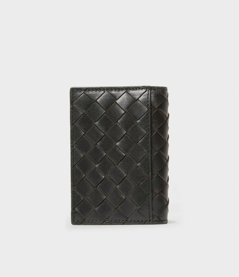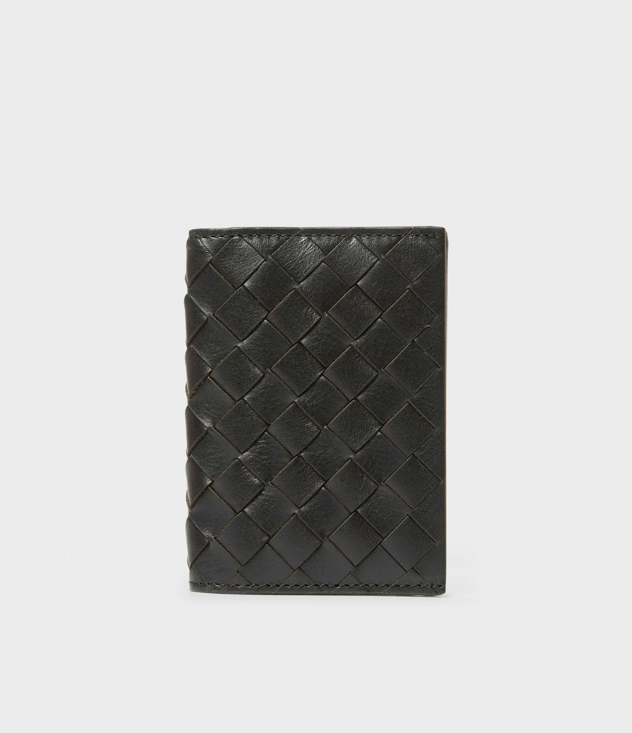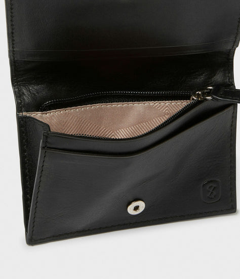 Plånbok Sparren från Saddler. En unik plånbok tillverkad av svart, flätat full grain-läder. Plånboken har fyra kortfack och ett myntfack med dragkedja. Den försluts med en tryckknapp. Plånboken har ett skyddande RFID-membran i fodret. Spännet är tillverkat av blank silverfärgad metall. Lädret i den här produkten är av högsta kvalitet och har behandlats i ett garveri certifierat av Leather Working Group.