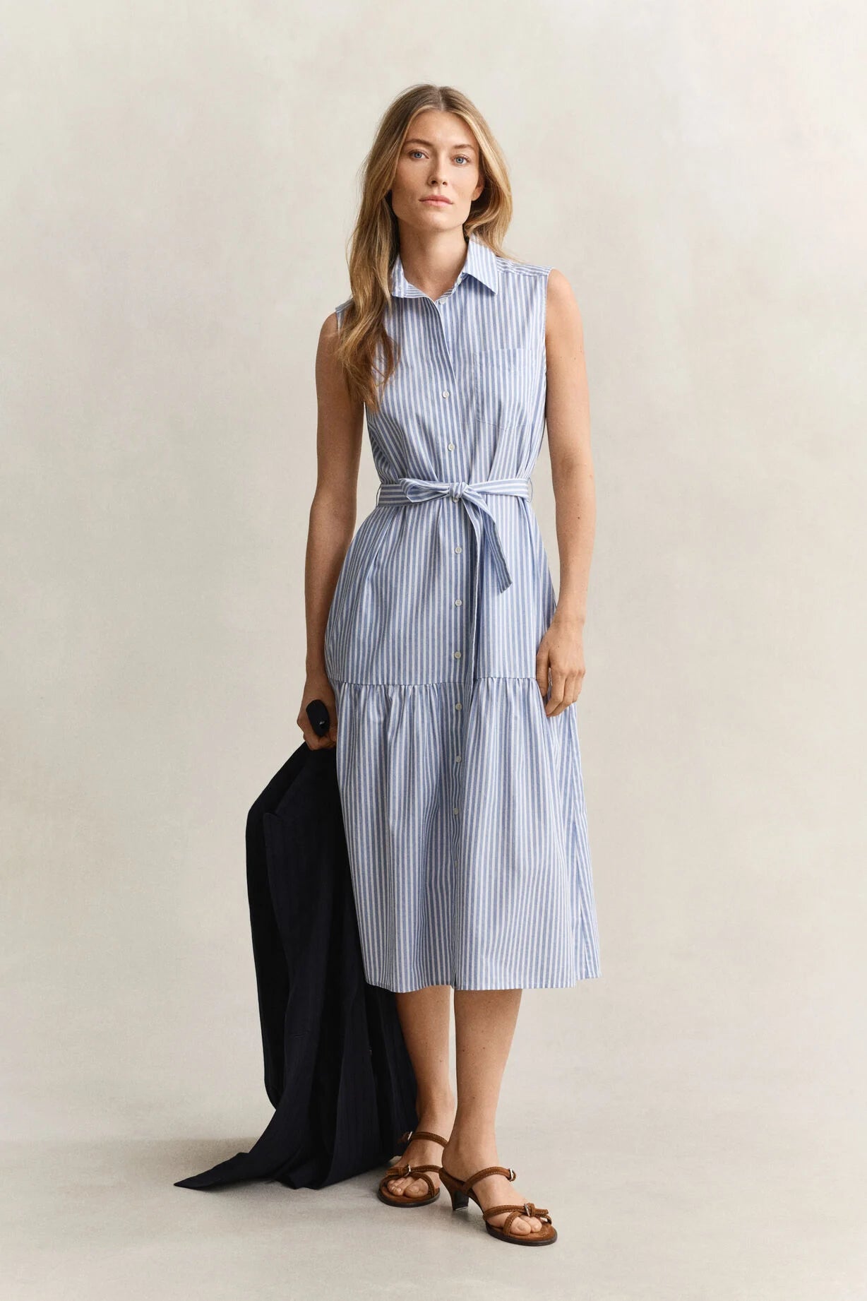 Den här randiga klänningen är tillverkad i 100% bomull med fil-à-fil-konstruktion – ett tyg där varp- och inslagstrådarna i olika färger skapar en unik och livfull struktur. Den ärmlösa klänningen med säsongens randiga mönster är designad av vårt eget team. Den har en regular fit och en A-linjeform som slutar mitt på vaden. Den har paneler i nederdelen, vilket skapar en veckad look och ger dig större rörelsefrihet. Andra detaljer inkluderar sidsömmar, bröstficka, knappslå och bälte i midjan.