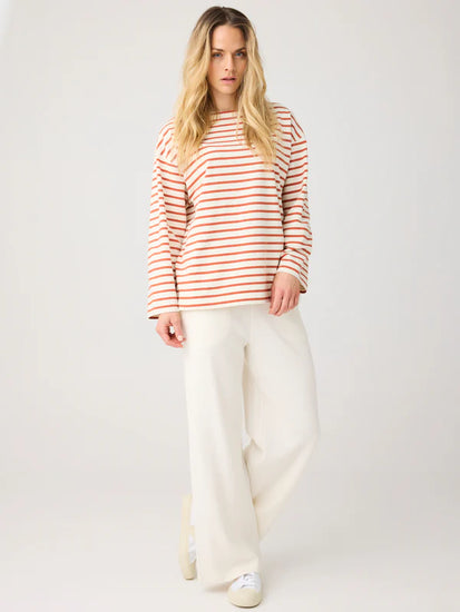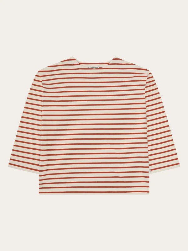 Denna randiga långärmade T-shirt från KnowledgeCotton Apparel ger en tidlös och avslappnad look med en modern känsla. Tillverkad i mjuk ekologisk bomull erbjuder den enastående komfort och god andningsförmåga hela dagen. Den avslappnade passformen ger rörelsefrihet och en ledig silhuett, vilket gör den till ett perfekt basplagg för vardagen. Med sina rena linjer och klassiska randiga mönster passar T-shirten lika bra till jeans som till chinos för en mångsidig outfit som fungerar vid alla tillfällen.