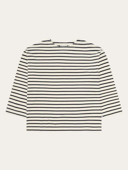 Denna randiga långärmade T-shirt från KnowledgeCotton Apparel ger en tidlös och avslappnad look med en modern känsla. Tillverkad i mjuk ekologisk bomull erbjuder den enastående komfort och god andningsförmåga hela dagen. Den avslappnade passformen ger rörelsefrihet och en ledig silhuett, vilket gör den till ett perfekt basplagg för vardagen. Med sina rena linjer och klassiska randiga mönster passar T-shirten lika bra till jeans som till chinos för en mångsidig outfit som fungerar vid alla tillfällen.