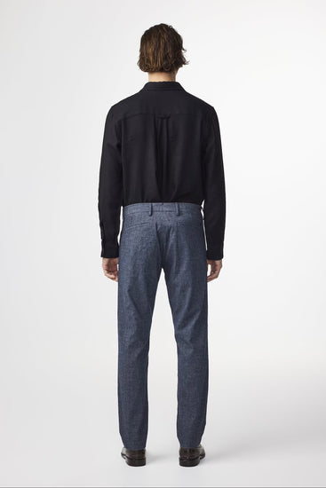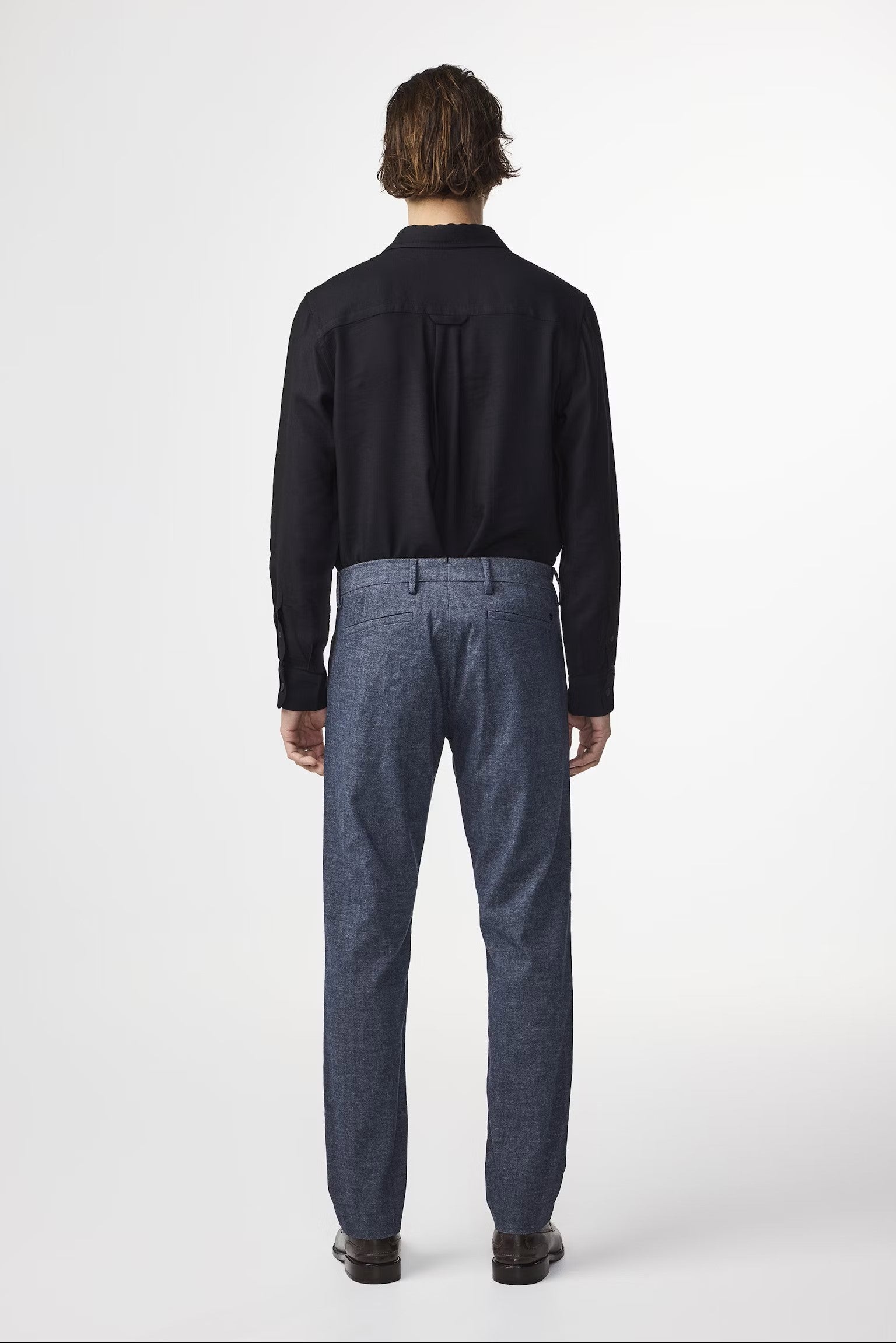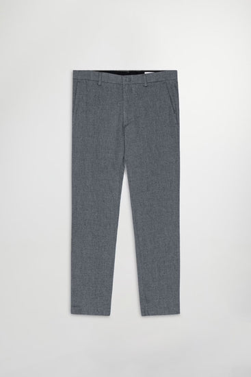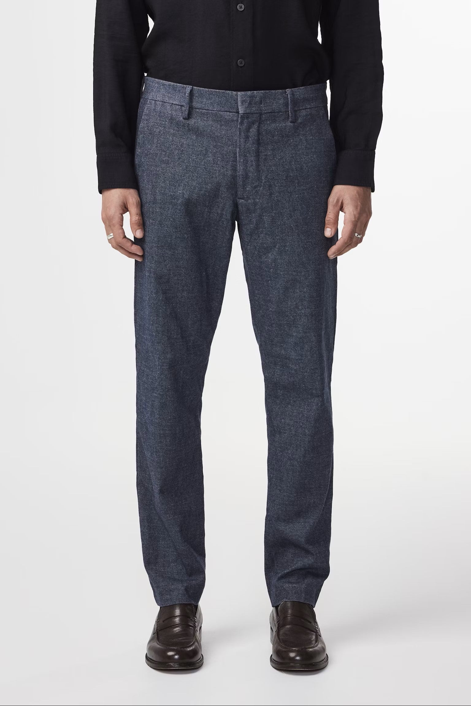 Slim fit tailored chino med avsmalnande ben tillverkad i en 279 g/m2 borstad bomullskypert melangeblandning med en touch av stretch för komfort. Komplett med ett snyggt veck och blindfåll. Skräddarsydda detaljer med Cobrax-hake och öglestängning och passpoalfickor med lock.